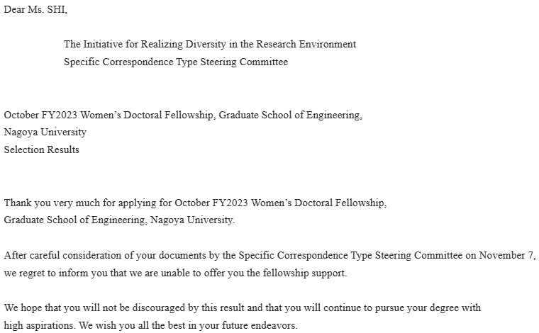 Is it so hard to apply for a PhD scholarship in Japan? I guess there should be not many female doctoral students in the graduate of engineering, except for not applying, so the competitiveness should not be so big (Unknown quantity Choice 4). Based on this and my confidence in my phD’s programe, I am motivated to apply for this scholarship.Unfortunately, I got an A band in the JSPS scholarship application evaluation and did not get this one. Good, good, good!