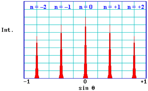 For two isolated scattering centres the diffracted intensity varies slowly between zero (complete destructive interference; d = ((n+1/2)λ) and its maximum value (complete destructive interference; d = nλ)-with a large periodic array of scatterers, but, the diffracted intrensity is only significant when the “Brag condition” is satified exactly. The diagram below shows tupical intensity profile for this case.