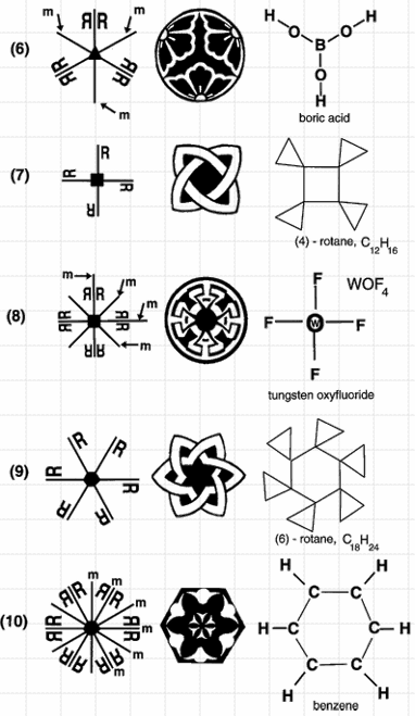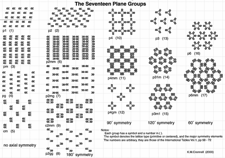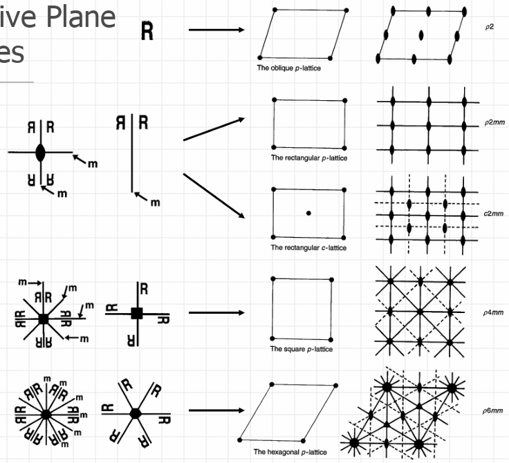 2D symmetry elements (10 two-dimensional cyrstallographic or plane point groups): One-folf axis (no symmetry); Vertical mirror line; vertical and horizontal mirror lines; two-fold rotation axis; three-fold rotation axis; three-fold axis + vertical mirror line; four-fold axis; four-fold axis + mirror lines; six-fold axis; six-fold axis + mirror lines.